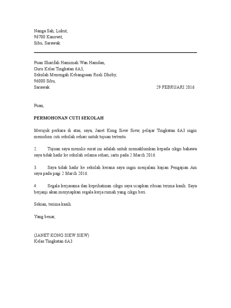 Contoh Surat Permohonan Cuti Sekolah Pdf